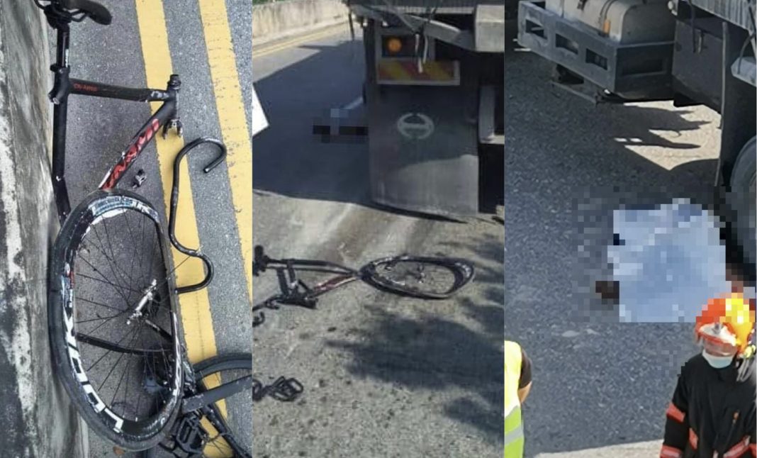 Facebook page SG Road Vigilante – SGRV uploaded photos of the accident, one showing the dump truck, a bicycle broken into two and a graphic image of what appeared to be a leg a few metres away.
