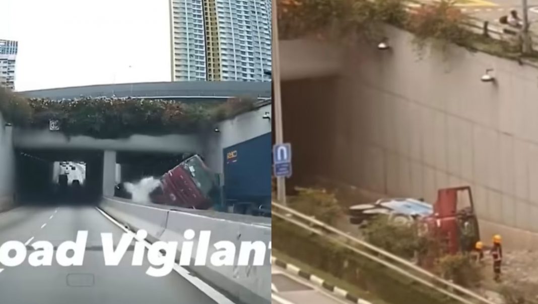 Eyewitnesses captured the incident on dashboard cameras and promptly shared the footage via SG Road Vigilante’s Facebook page. The video revealed a red truck, towing a blue container, attempting to swerve to the right to avoid colliding with another truck. Unfortunately, the manoeuvre caused the truck to collide with the road’s dividing line, overturning the vehicle.