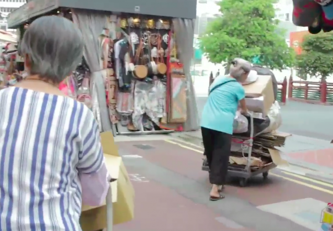 Two elderly ladies who collect and sell cardboard for a living spoke about how much harder their jobs became when a collection point at Chinatown was shut down, causing them to have to walk up to 30 minutes more, pushing their heavy trollies, to another collection point.