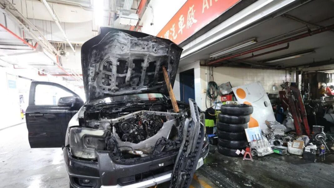 According to reports, a black Ford Ranger vehicle was parked in front of the shop with one door and hood open, and the engine of the vehicle was burned. A 32-year-old sanitation worker shared with Shin Min Daily that when he arrived in the area, he saw the thick smoke and could hardly see the road ahead. He also had trouble breathing since the smell was so strong, so he needed to put on a mask.