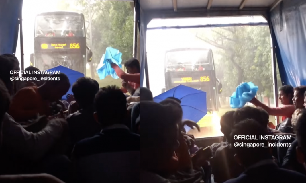 The Aug 22 video on Singapore Incidents shows a large group of men crowded into the back of a lorry. They’re shown sitting on both sides of the truck bed and in the middle. With the rain coming in from the back of the vehicle, the two men at the end of each side open umbrellas to shield them from the deluge, but unfortunately, the man’s umbrella on the right side malfunctions at first.