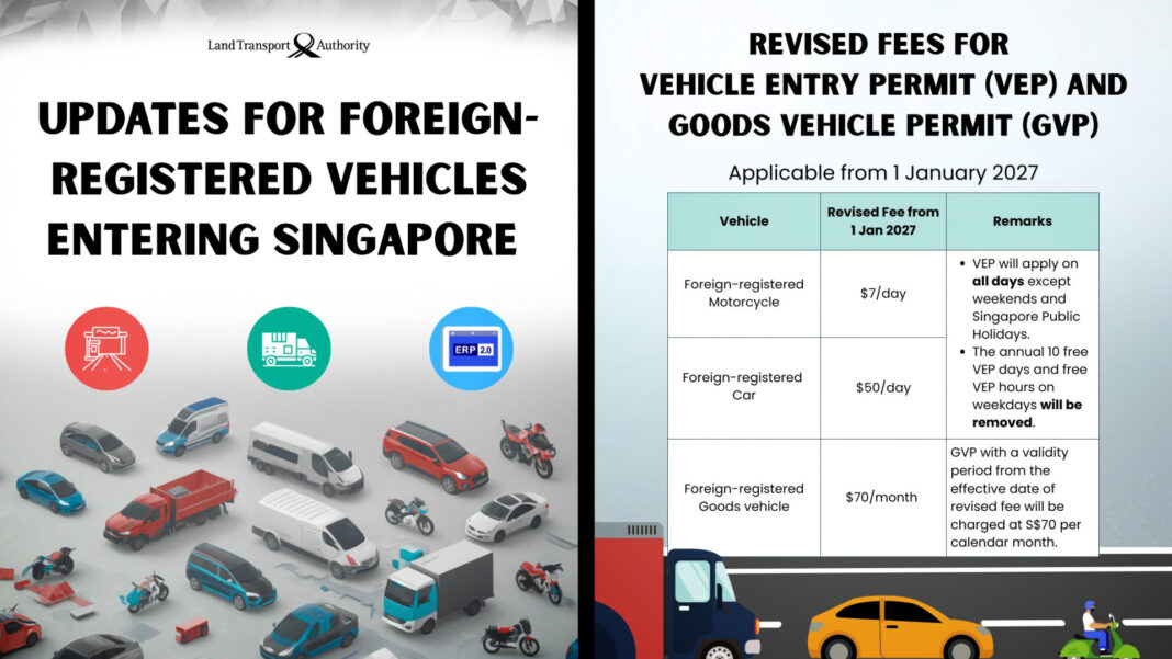 From 2027, the Vehicle Entry Permit (VEP) fee will rise to S$50 per day for cars and S$7 per day for motorcycles. This is up from S$35 and S$4 today. The fee will apply to all weekdays, except weekends and Singapore public holidays.