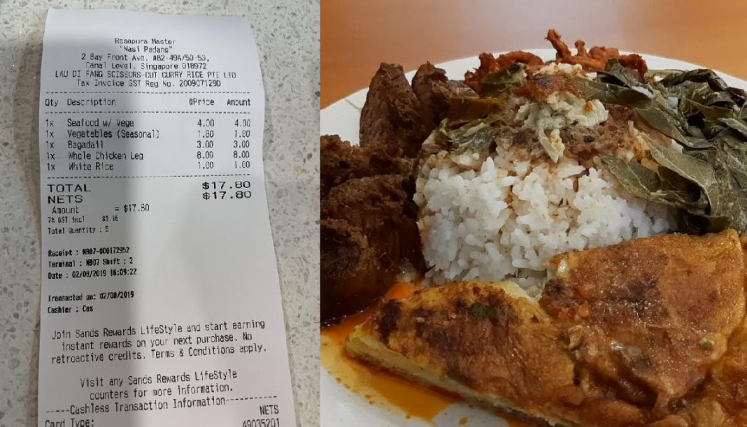 The receipt, which is dated 2 Aug 2019, shows that the customer ordered seafood, vegetables, a whole chicken leg and a bagadail to go with his white rice. He was charged a hefty $18.70 for the meal at the Rasapura Masters food court in the Basement 2 level of Marina Bay Sands.