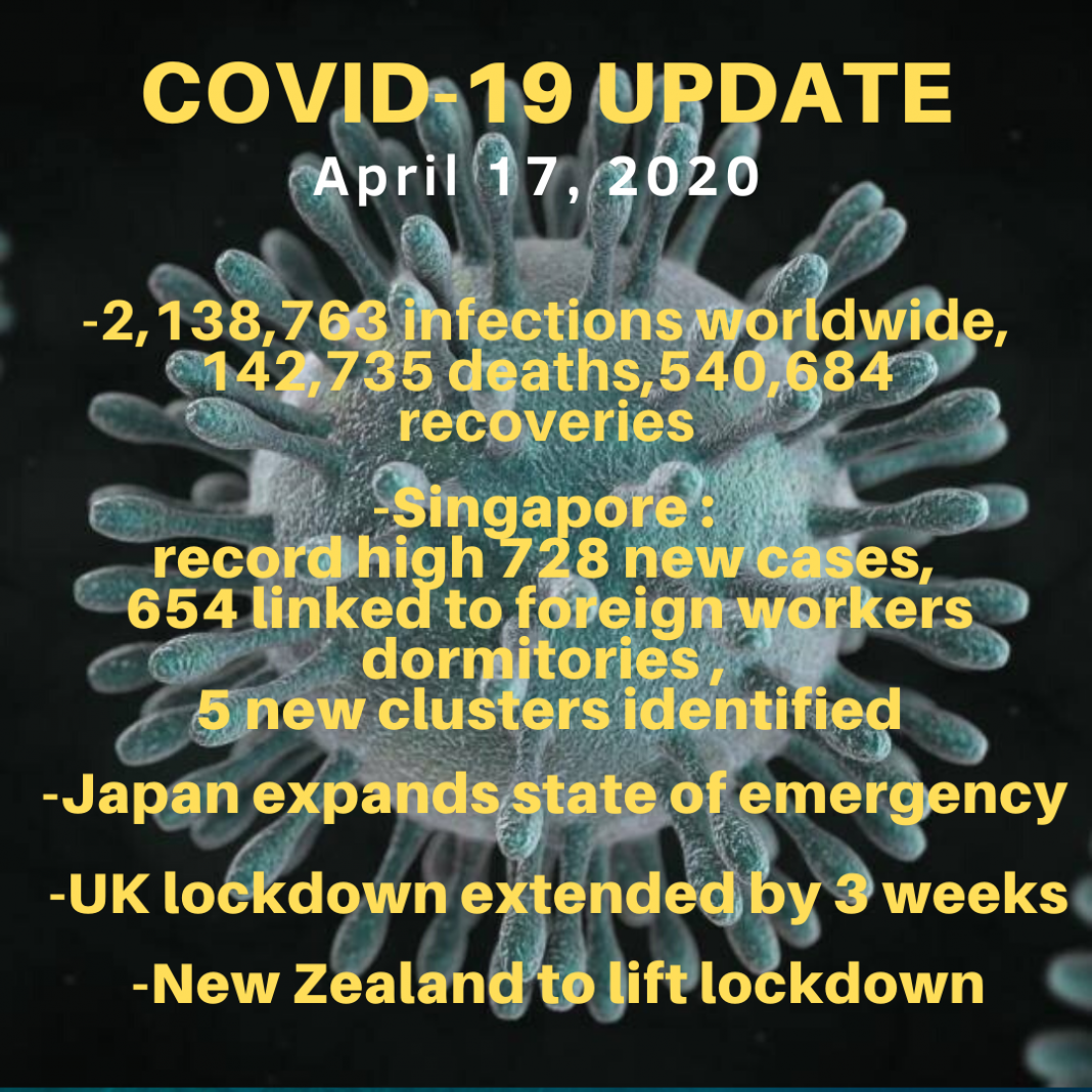 In Singapore, a new daily high of 728 new cases was reported by the Ministry of Health (MOH) on April 16. Of these 654 were linked to workers dormitories with five new clusters identified.