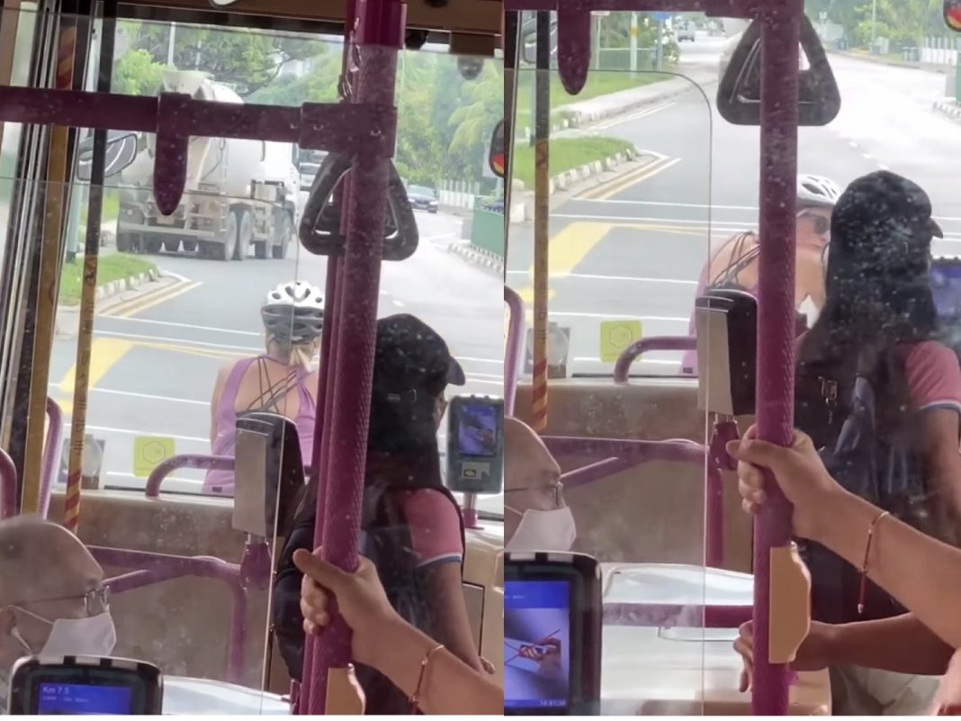 Singapore – A Caucasian woman cyclist was spotted on camera blocking the path of a bus and looked behind her for a few seconds before making her way. The issue of a designated lane for cyclists was highlighted among netizens.