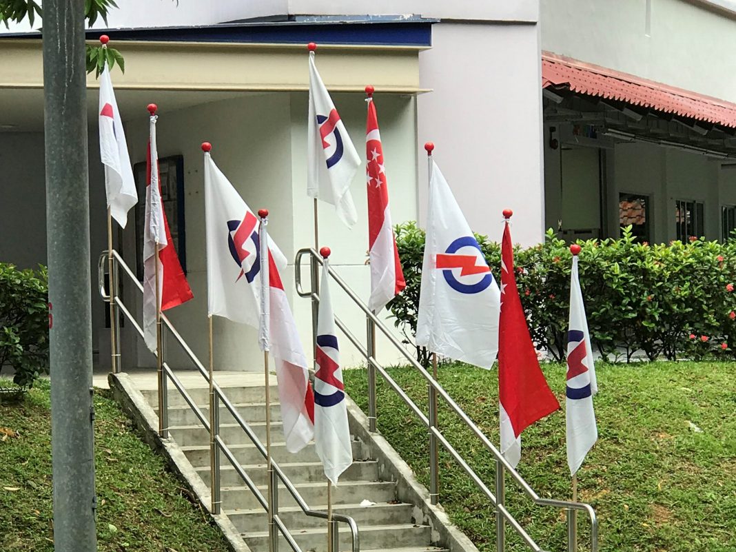 There are a total of ten flags and the majority of the flags, six out of ten, bear the logo of the ruling People’s Action Party (PAP). The remaining four flags are the national flag of Singapore.