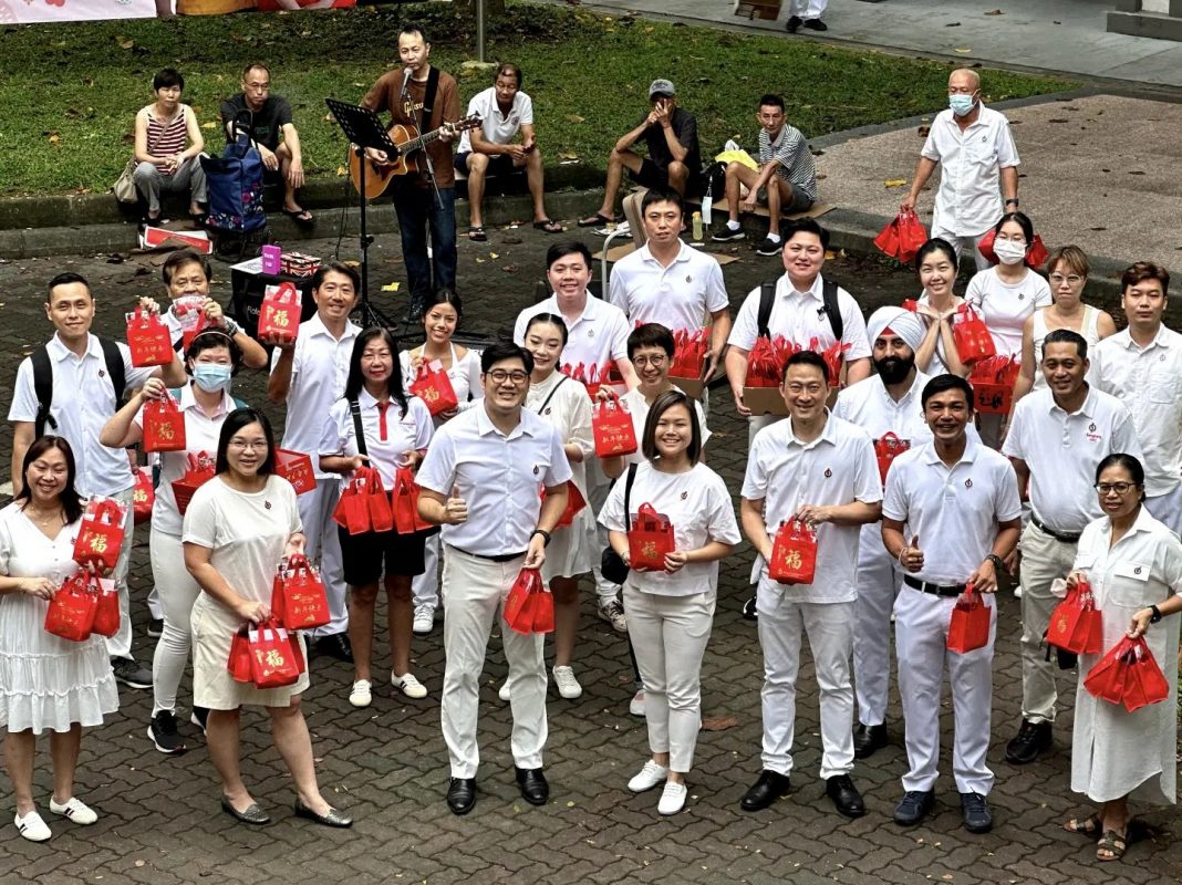 Clad in their traditional all-white attire, Lam was joined by their fellow volunteers as they handed out the mandarin oranges to the residents. Lam is the only member left from the 2020 General Election, while the other three are new faces announced in March 2022, replacing Ng Chee Meng, Amrin Amin and Raymond Lye.