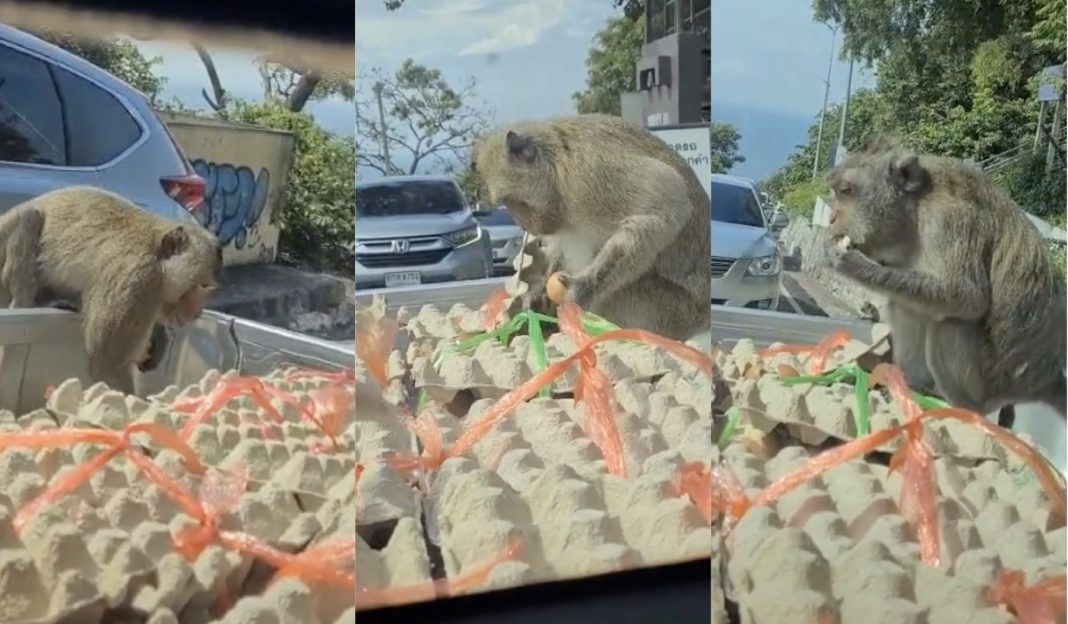 A video uploaded online by Thai TikTok user @siangthong_ple captured the primates’ mischief, showing them expertly grabbing and cracking open carton trays in a pickup truck. These clever monkeys didn’t stop at just one; they were spotted taking one or two eggs before leaving the sceneThe amusing footage went viral, with viewers praising their ingenuity.