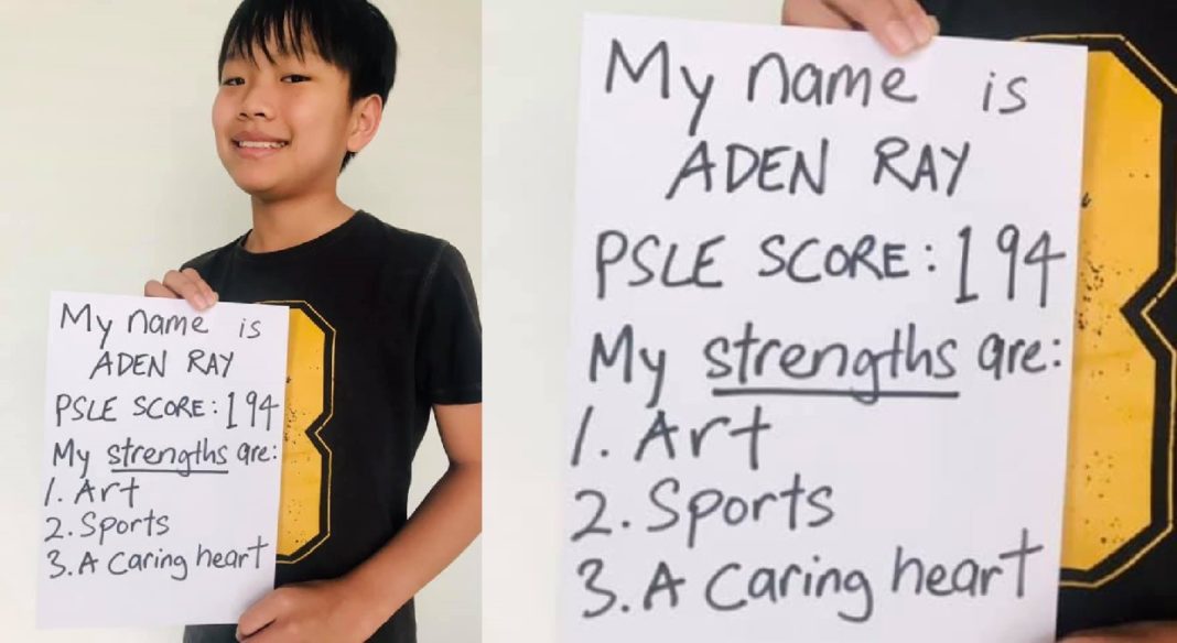 Mr Ray proudly shared a photo of his son holding up a sheet of paper that displays his name, his PSLE score of 194 and three of his strengths. Young Aden Ray lists his top strengths as art, sports and a caring heart.