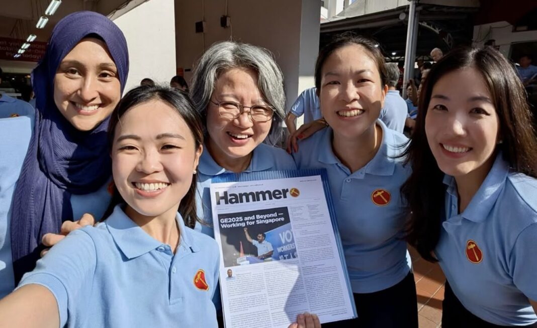 The women, all dressed in WP blue, had been at Kovan 209 Market & Food Centre to distribute The Hammer, the party’s newsletter.
