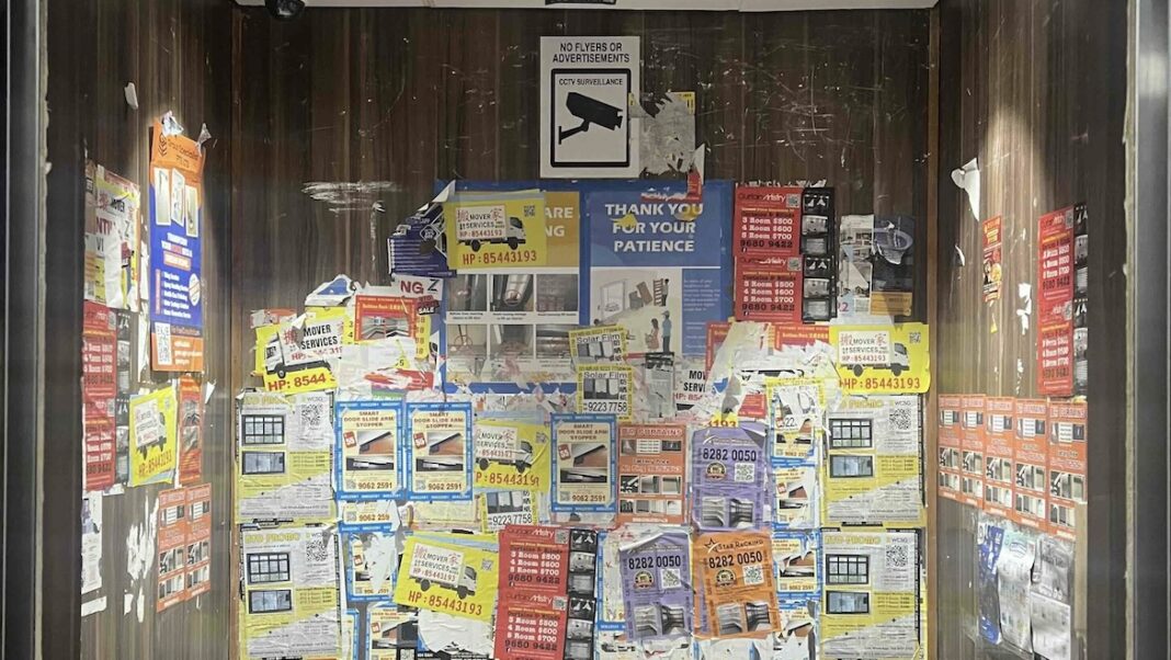 SINGAPORE: Earlier this week, a resident posted a photo of a lift heavily peppered with flyers on the walls, with some even on the ceiling, captioning it with “I burst out laughing walking into this lift.”