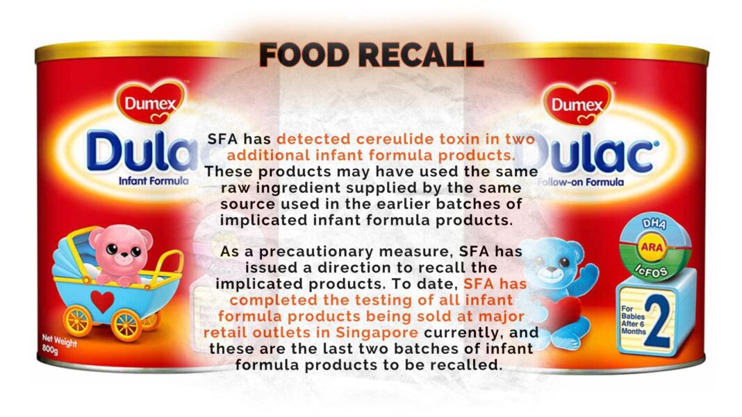SINGAPORE: The Singapore Food Agency (SFA) has ordered a recall of two more infant formula products after tests found cereulide toxin, according to a media release dated Jan 30. The move follows two additional cases of infants who fell mildly ill after consuming the affected products, bringing the total to three cases so far. All have since recovered.