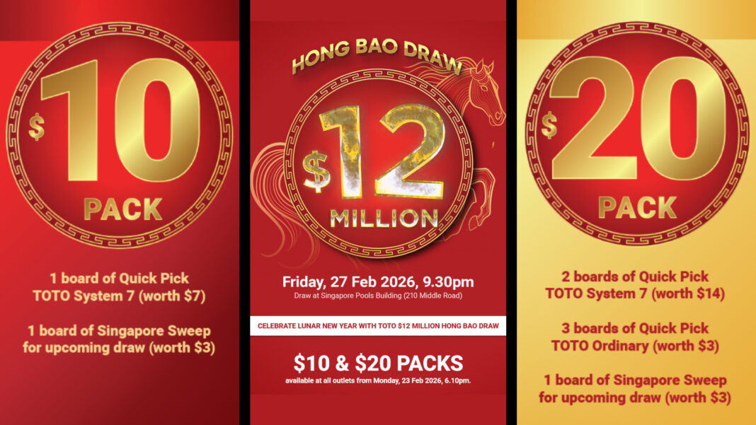 SINGAPORE: First prize starts at S$12 million as Singapore Pools extends outlet sales hours and rolls out festive packs. The annual Toto Hong Bao draw will take place on Feb 27 at 9:30 p.m.